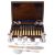 Condition: Two ivory handles have cracks, ivory has dulled and some handles have stains. Case slightly distressed. One napkin ring with damages