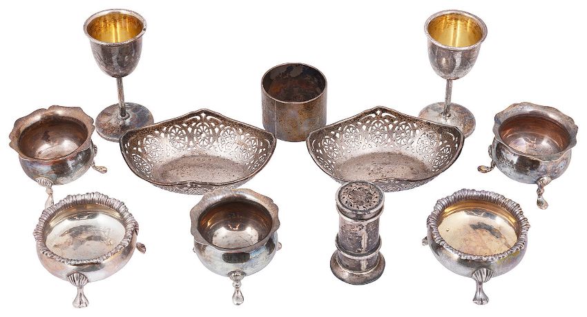 comprising a pair of small liqueur goblets, London, 1907 by the Goldsmiths & Silversmiths Co., a pair of Georgian style cauldron salts with gadrooned rims, London 1897 by Charles Stuart Harris, a Victorian silver pepper pot, Birmingham, 1888 by Stokes and Ireland, a pair of oval pierced bonbon dishes, a set of three cauldron salts and a heavy plain silver napkin ring engraved with a monogram, (11)