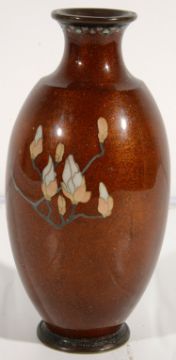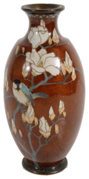 of ovoid form, decorated with silver wire and coloured enamels with a songbird perched on a magnolia in blossom against a gold flecked bronze coloured ground