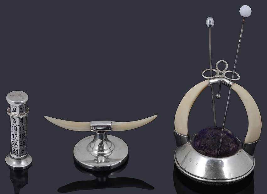 A George V silver perpetual calendar hand seal, a silver mounted boars tusk pin cushion and fob watch stand and a mother of pearl mounted knife rest