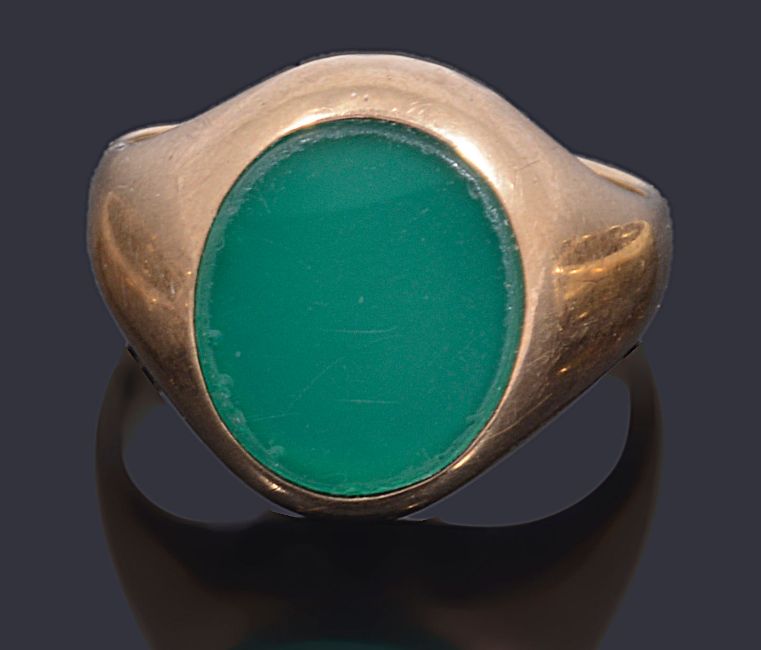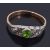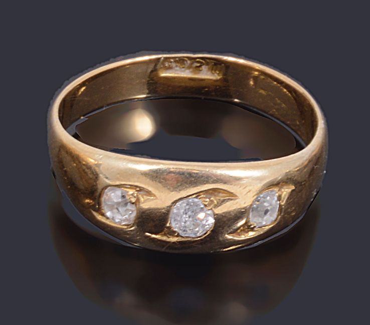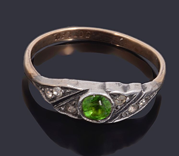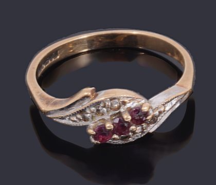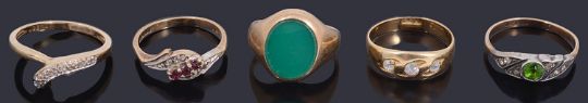 to include an 18ct gold three stone diamond ring, a 9ct gold signet ring with green quartz insert, a 9ct gold diamond crossover ring, a 9ct ruby and diamond ring and green paste stone ring marked sil & gold (5)