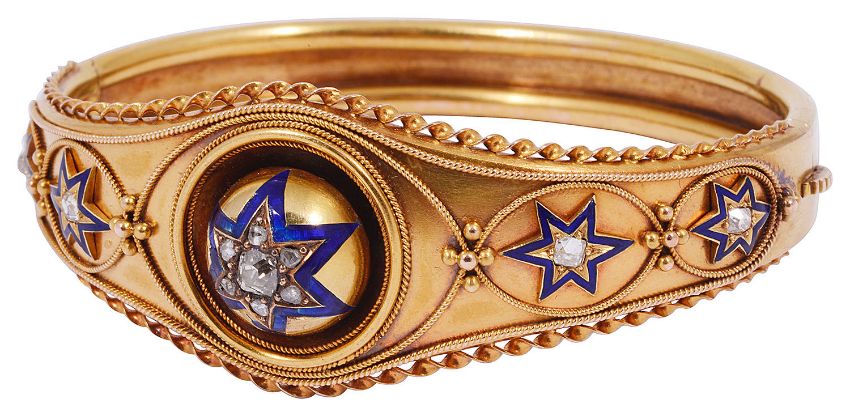an old European diamond set to blue enamel star surround on a raised circular boss, with twisted wire and bead detailing, four further diamond and blue enamel stars and a twisted wire border, all to the top section of the hinged bangle with polished under section, in a 'J.J Durrant & Sons' fitted case.