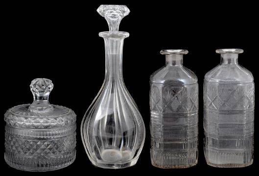 the circular pot with fluted sides and a band of diamonds, the cover spiral fluted with knop handle, the spirit decanters with canted corners, and mitre cut decoration, stoppers absent, the decanter and stopper possibly continental, facet cut with flat mushroom stopper, (4)