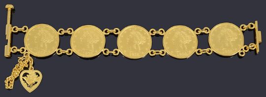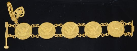 five "prize jewellery modern flower" coins channel set between with jump rings, terminating screw pin and catch fitting, heart shaped charm and safety chain. Chinese character marks to the clasp