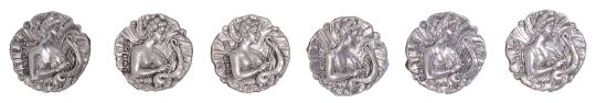 of petal shape, embossed with a maiden playing a lyre, (6)