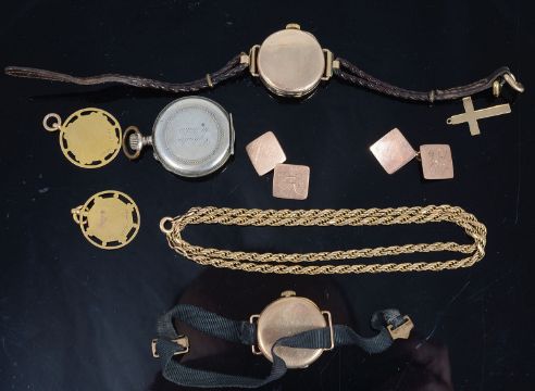 to include a 9ct gold rope chain necklace, a pair of 9ct gold cufflinks, two 9ct gold pendants, a 9ct gold cross, two 9ct gold ladies watch heads and a silver ladies fob watch (qty)