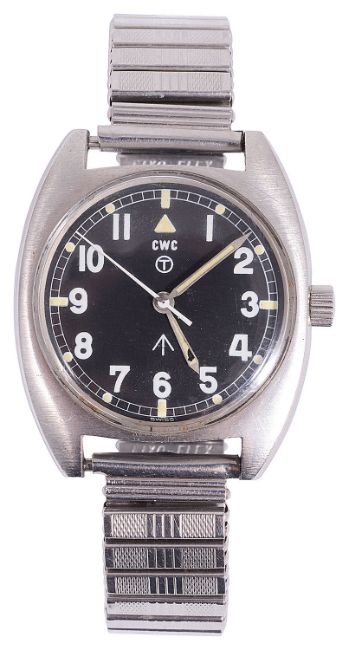black dial with luminous Arabic numerals and hands. Case stamped 6BB-6645-99 523-8290, 857/79 with broad arrow on a later expanding bracelet