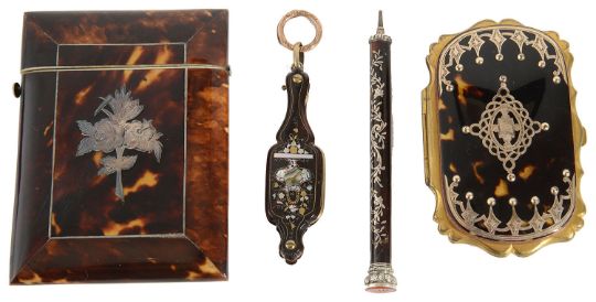 comprising a pair of French folding sprung lorgnettes, the frames marked with French 18ct gold guarantee mark, the handle inlaid with mother of pearl and gold and silver pique work, attached a foliate embossed gilt metal split ring, an early Victorian silver and tortoiseshell propelling pencil, having foliate pique work inlaid shaft, screw fitting foliate embossed terminal set with hardstone bearing initials and sliding action, a Victorian visiting card case of rectangular from with hinged lid having silver stringing and central embossed floral spray, and a gilt metal purse mounted with tortoiseshell and pique work panels, initialled and having pink silk interior with divisions, (4)