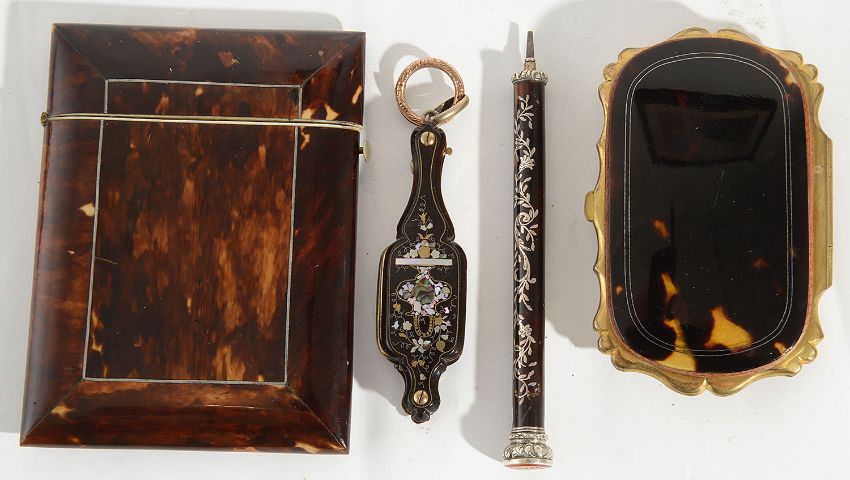 A small collection of 19th century tortoiseshell and pique work items to include a pair of French lorgnettes with gold frames
