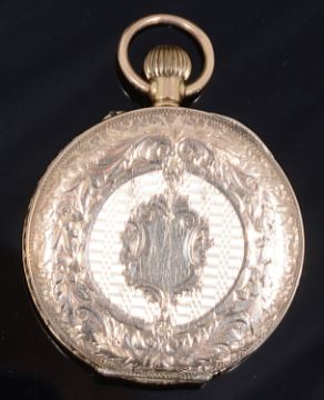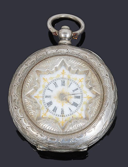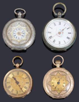 to include a 12ct gold ladies top wound fob watch, a gold star framed dial with roman numerals and a highly engraved case, a 14ct gold fob watch, a silver key wound fob watch, with star framed white enamel dial and roman numerals and another silver example (4)