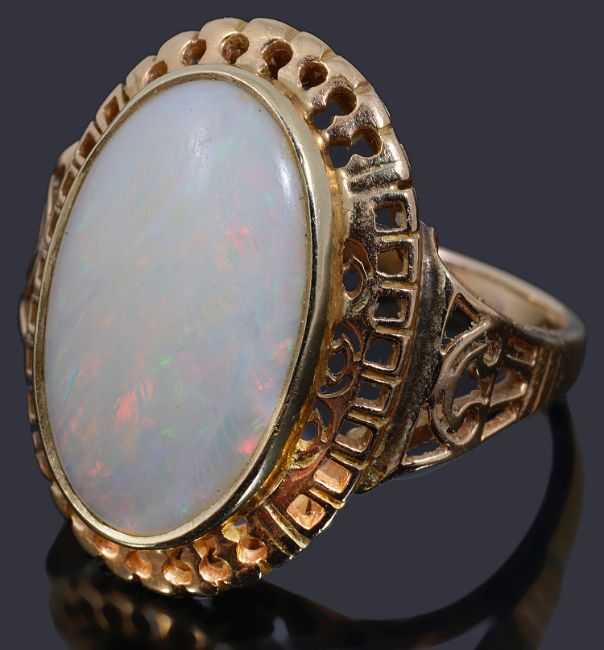 an oval shaped opal cabochon, rub set to a decorative pierced head and shoulders to a plain polished shank
