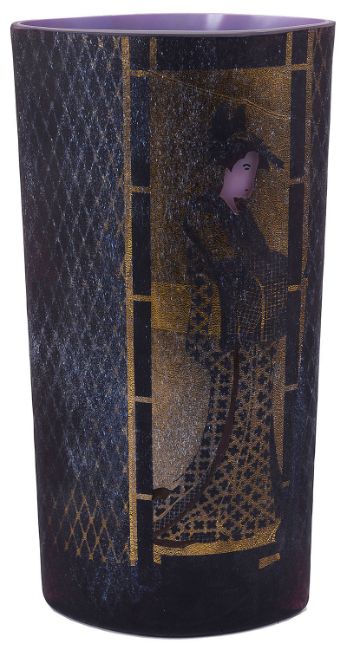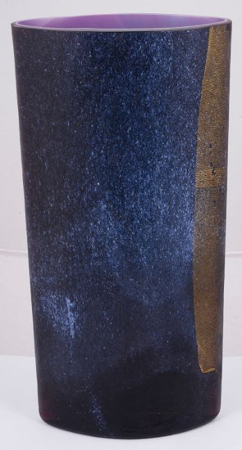 of compressed sleeve form, cased in mottled lilac with aventurine highlights over deep amethyst, acid cut decorated with