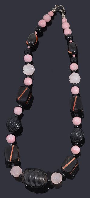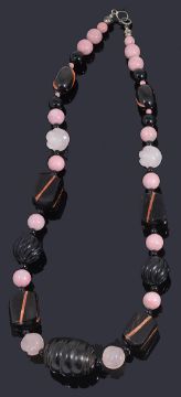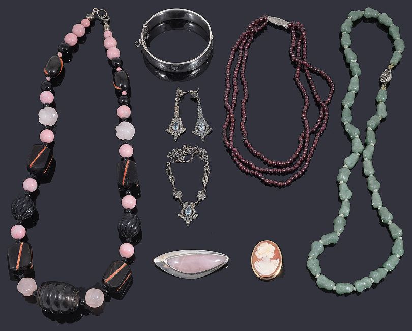 A collection of gemstone jewellery,to include three row garnet bead necklace with silver clasp, a silver blue gemstone and marcasite centrepiece necklace and matching earrings, a Italian gold shell cameo pendant, marked 375, a silver hinged bangle, a silver rose quartz brooch, a single row aventurine bead necklace and a single row rose quartz, rhodochrosite and black bead necklace (qty)cameo brooch: 4.4g, length approx. 3.2cmCondition: mixed lot: general condition good