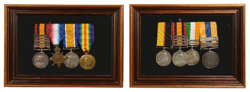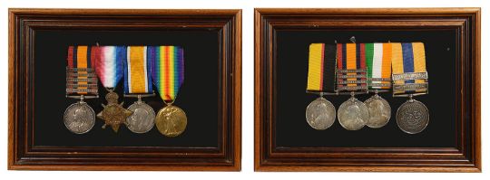 first group awarded to 2991 Pte H. Holdaway 1st Battalion, Queen's Own Cameron Highlanders, formed of Queens Sudan medal, A Queens South Africa Medal with Wittebergen, Diamond Hill, Johannesburg and Cape Colony, a Kings South Africa Medal with 1901 and 1902 bars, and a Khedive's Sudan medal with Khartoum and The Atbara bars, second group warded to 1128 Sjt. Holdaway, 3rd (City of London) Battalion, London Regiment (Royal Fusiliers) late 71300 G Battery Royal Horse Artillery, formed of Queens South Africa Medal with Diamond Hill Johannesburg, Driefontein, Paardeberg and Relief of Kimberley bars, 1914-15 campaign star, 1914-1918 British war medal and Victory Medal, all with ribbons, each mounted and framed, (8)