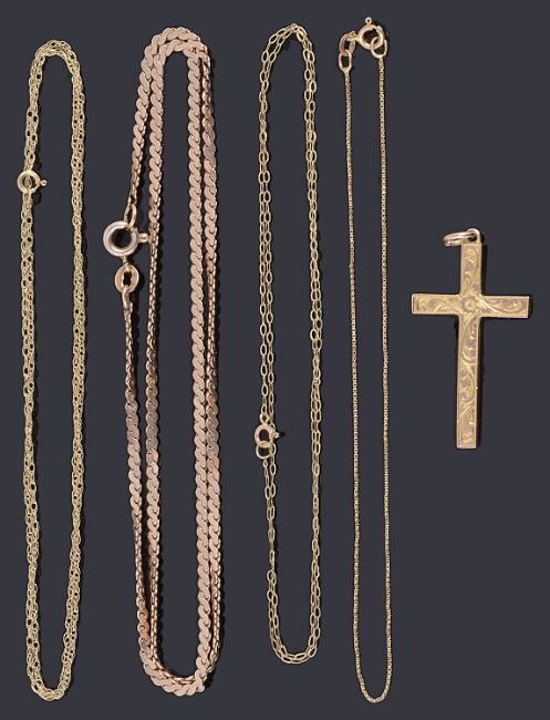 A gold cross pendant and four assorted chainsa gold cross pendant engraved to one side with floral decoration marked 9ct together with a gold S-link chain, a gold box link bracelet, a gold prince of Wales chain and another gold belcher chain (qty)total weight 10.9gCondition: All in good condition. chains test as approx 9ct gold