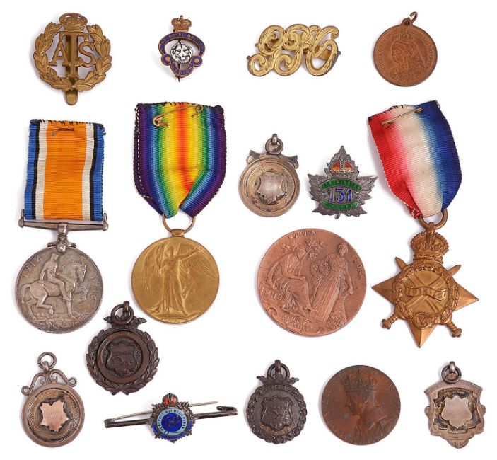 Description: A World War 1 medal group and other medallions etc.the medal groups formed of 1914-15 star, War medal and Victory medal, on ribbons, awarded to 18920 PTE A. E, Allington. Gloucester Regiment, together with a silver and enamel 131st Westminster CEF badge, assorted silver and bronze prize fob medals, an RHS Pomona Flora medal etc. (qty)various Condition: Fair condition, some rubbing to medals