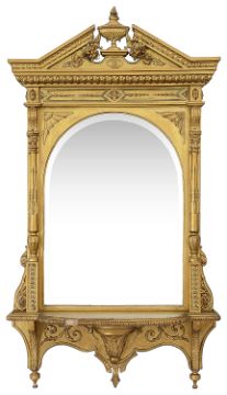 A late Victorian giltwood and gesso wall mirror surmounted by a broken pediment with an urn and garlands above an arched bevelled plate and bracket shelfheight 108 cm. Condition: Overall fair condition, small loss to gesso on front of the shelf, finial of urn has been repaired. later touch ups to gilt with gold paintPlease note that this lot needs to be collected and paid for by Friday 11th September 4:30pm