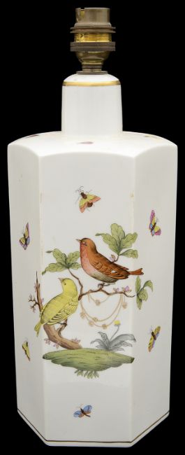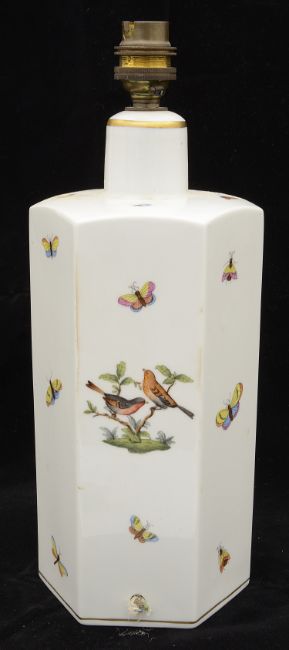 A Herend porcelain hexagonal table lamp decorated with birds and insects, incised 6471 printed and painted marksheight including fitting Condition: Good condition.