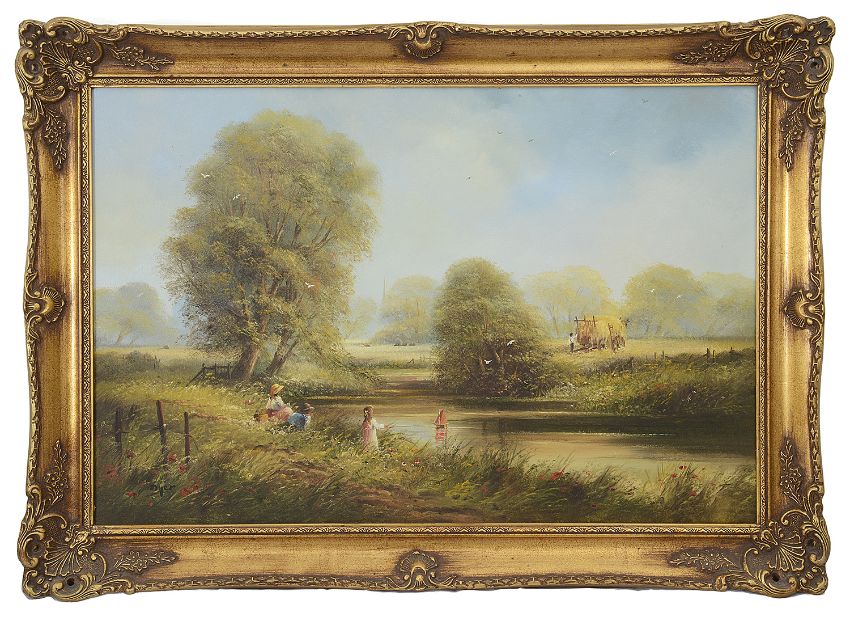 Ted Dyer (British, b.1940)'Rural river landscape with trees, a haywain and children on the banks', oil on canvas, signed bottom left, framedcanvas 51 x 76 cm., overall 65 x 89 cm.Condition: Good condition