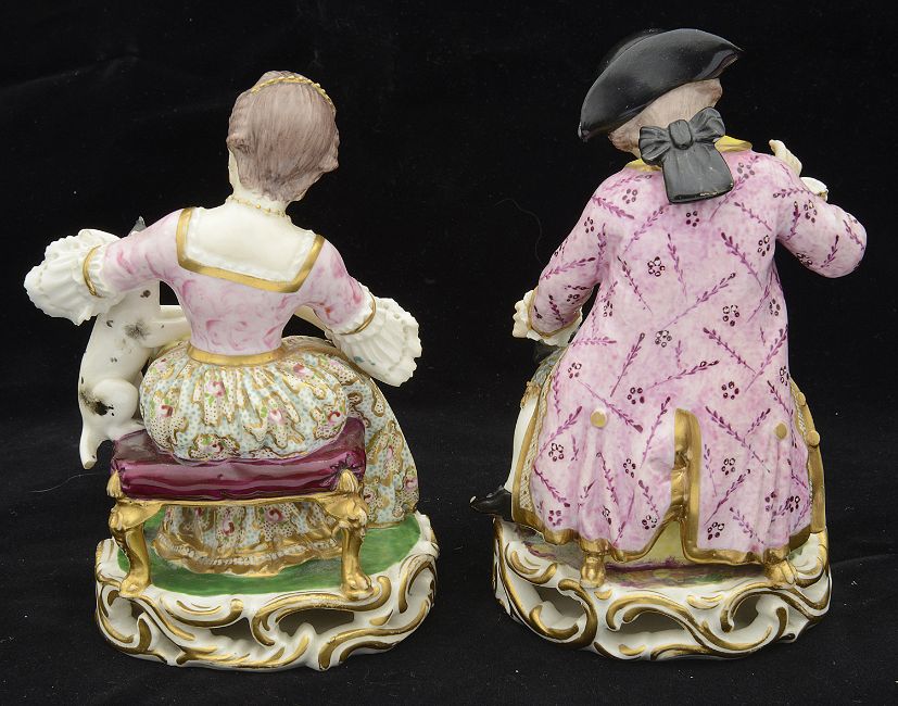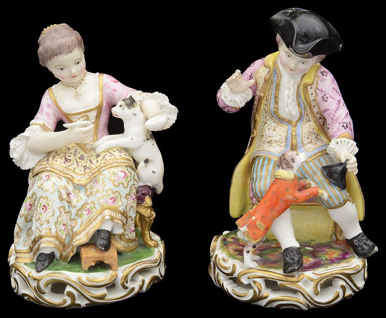 A pair of early 19th century Bloor Derby porcelain figures c.1820 one modelled as seated gentleman playing with a dog, the other as a seated lady with a cat, on pierced scroll bases, both incised No 362, overglaze blue cross swords marksheight 15.5 cm.First with loss to dogs tail and slight chip to one corner of hat. Second with loss to spoon. Left hand has been repaired as has head. Now left hand present but detached, tip of cats tail off