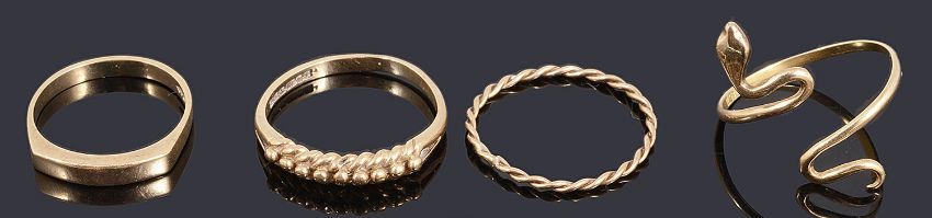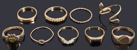 Nine assorted gold ringsto include a gold snake ring marked 585, three 9ct gold signet rings, a 9ct gold claddaugh ring, a 9ct gold knot ring and three other gold rings (qty)total weight of 9ct gold: 11.4g. snake ring: 1.1gCondition: All have some signs of wear, the white stones are cubic zirconia, three other rings test as 9ct gold
