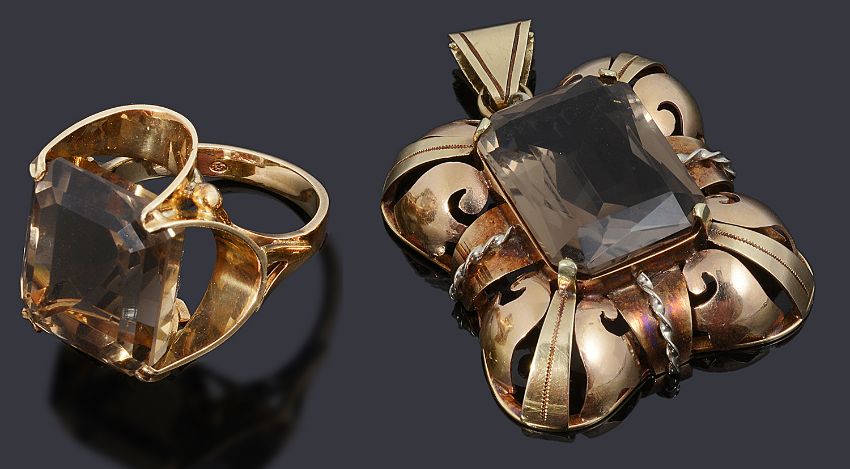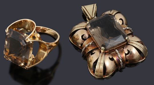 A Continental gold single stone smoky quartz ring and similar pendant circa 1970sa gold single stone fancy step cut smoky quartz ring, claw set to a bead and scallop border, with split shoulders and a plain polished shank marked 583 and a similar single stone smoky quartz pendant, the central stone claw set to a pieced scrolling border with twisted wire decoration suspended from a v-shaped baletotal weight approx: 23.6gCondition: Both tested as approx: 14ct. no obvious faults