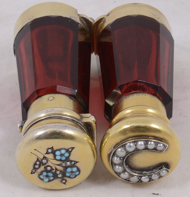 A Victorian silver-gilt mounted double ended scent bottle vinaigrette by S. Mordan & Co.of tapering faceted form, the screw fitting cover set with a seed pearl horseshoe, stamped S. Mordan & Co. Makers, the hinged cap with a turquoise and seed pearl forget-me-not, the hinged centre opening to reveal a foliate engraved pierced grillelength 13.5 cm.Condition: Some minor rubbing to gilt and a couple of scratches