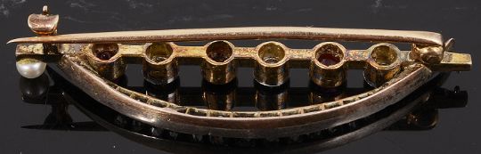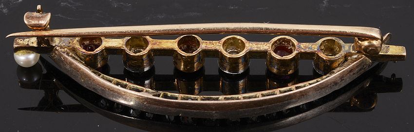 A delicate Edwardian ruby and diamond crescent broochan open crescent set with graduated old cut diamonds, with a bear of rub set circular rubies and old cut diamonds terminating with a seed pearl, having a 'c' scroll and pin reversetotal weight approx: 4.3gCondition: The bar has possibly been added as some put but is a period amendment missing one pearl, set in silver and backed in gold