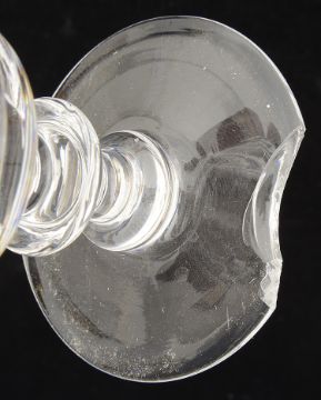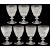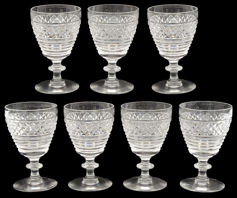 A set of seven 19th century small wine glassesthe tapering bowls step cut and decorated with a band of diamonds, on capstan stems and a plain foot (7)height 12 cm.Condition: Six in good condition. One with a large chip to foot