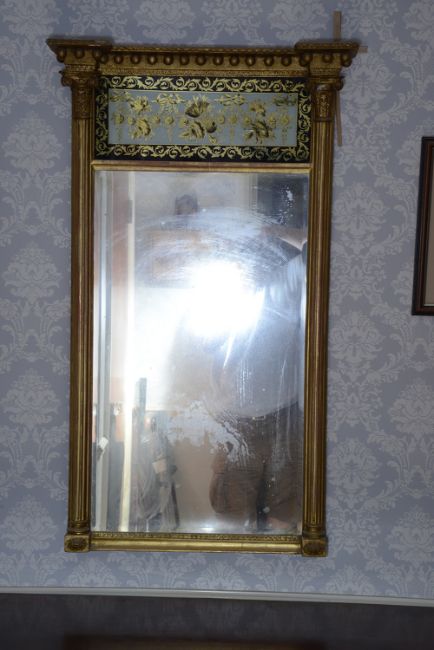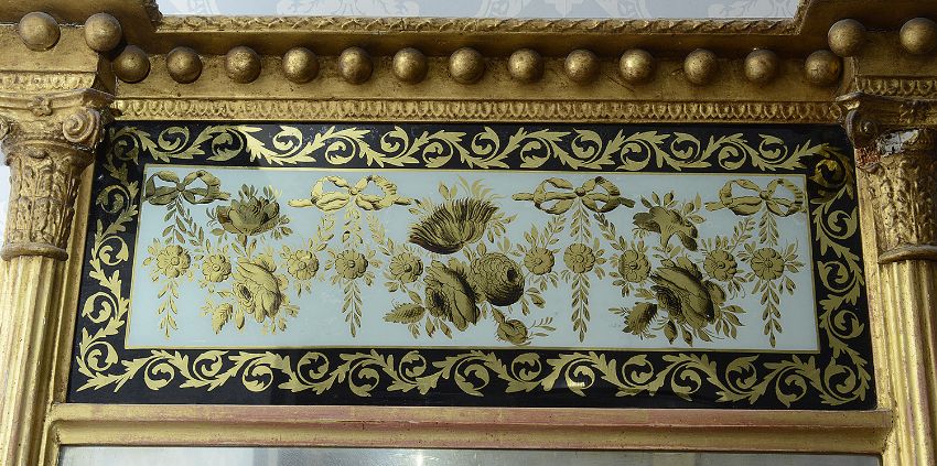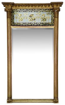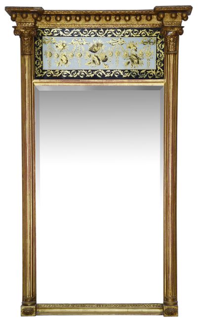 A Regency giltwood and verre elglomise pier glass the ball cornice above a verre elglomise panel decorated with ribbon tied garlands, flanked by fluted columnsheight 102 cm., width 61 cm.Condition: Small loss to damage to one columns capitalPlease note that this lot needs to be collected and paid for by Friday 11th September 4:30pm