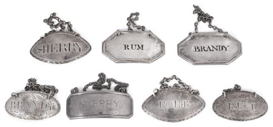 Four George III silver bright cut oval decanter labels comprising 'Brandy', double struck makers mark only, by John Huston, crested, 'Sherry', makers mark only, William Knight II, 'Rum', no town mark, probably London, 1793, maker mark T.M?, and 'Port' Susannah Barker, together with a pair of close plated labels enamelled in black 'Rum' and 'Brandy' and a another plated example, (7)first width 4.5 cm.Condition: Fair condition