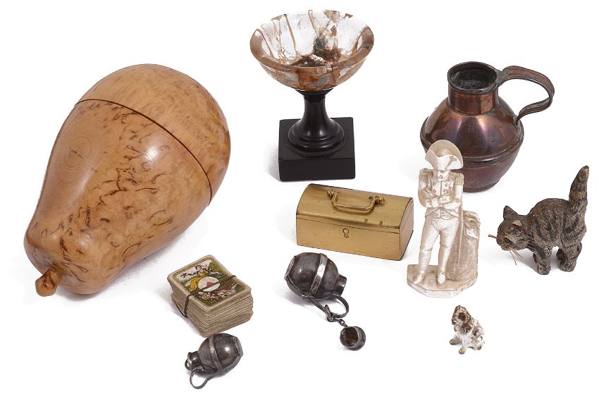 A collection of 19th century and later miniature items to include a turned hardstone tazza and carved ivory figure of Napoleoncomprising a carved figure of Napoleon Bonaparte, a turned hardstone tazza on slate foot, a pack of chromolithograph printed playing cards, a cold painted bronze of a seated spaniel, a treen pear containing a selection of turned miniature bowls, plates, beakers and other table ware, two silver Guernsey cans, a brass casket with a sliding base containing a set of dominoes, etc., (qty)height 4.4 cm.Condition: Good condition