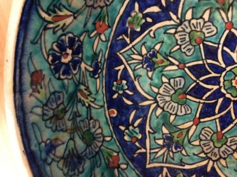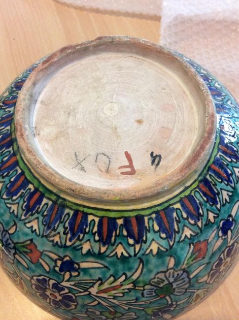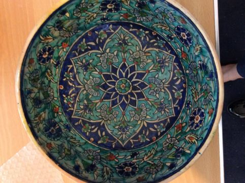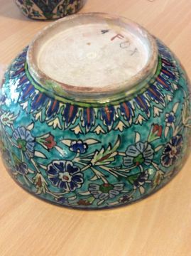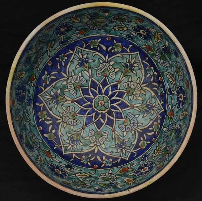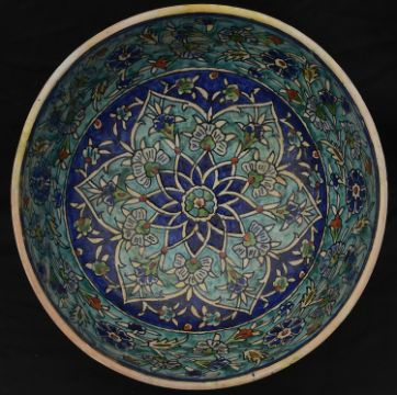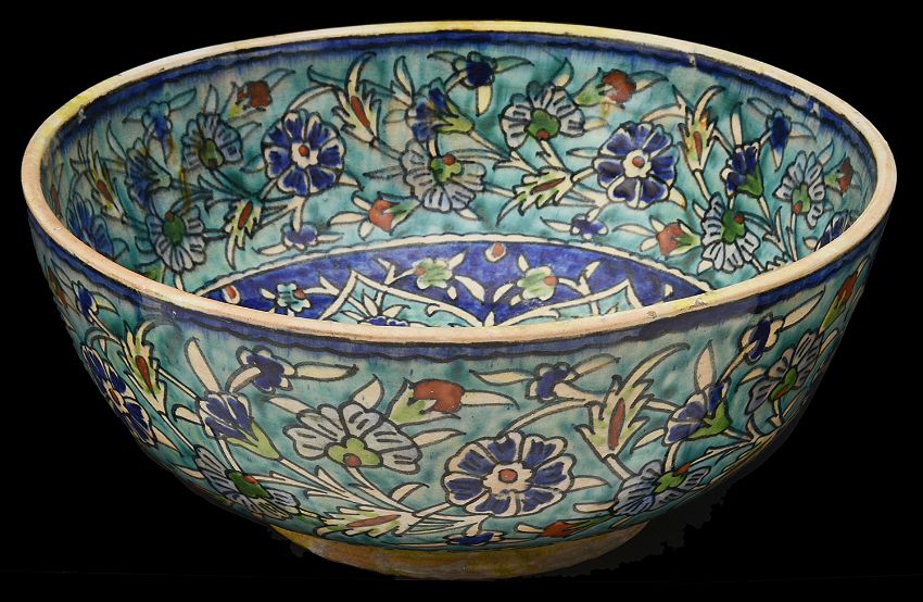 A large 19th century Iznik pottery polychrome tin glazed bowl decorated in green red and tones of blue with stylised flowers and foliage