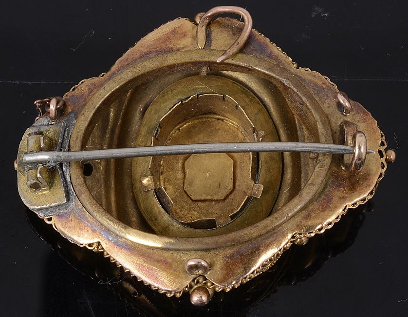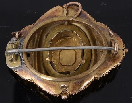 A Victorian single split pearl shield form broocha single split pearl, set to a raised star boss, with laurel leaf border and further bead and scroll detailingtotal weight approx: 14.7gCondition: Missing the glazed locket to the the reverse, the safety chain is broken, interior is gilt metal, pin not metal, surface tests as approx 15ct gold