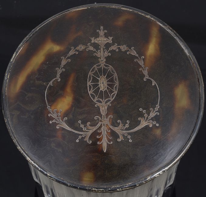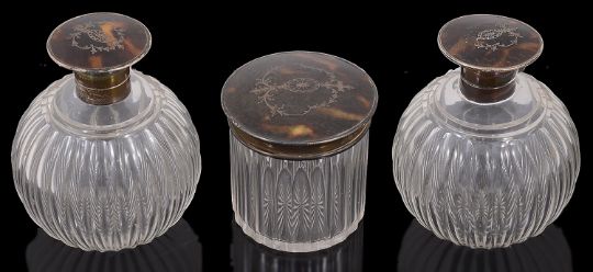 A pair of George V silver mounted tortoiseshell and pique work scent bottles and a dressing table pot,Birmingham, 1914 by Walker & Hall limitedthe scent bottles of globular form, cut with flutes, the hinged flattened caps inlaid with fan oval patterae and scrolls, with internal stoppers, (3)height of scent bottles approx: 11.2cm, height of jar approx: 8.5cmCondition: The silver has tarnished and some small dents in places