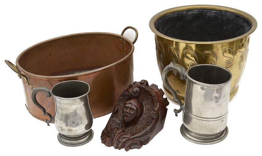 A mixed lot of metalware and othercomprising a Dutch Secessionist K.D.M Daalderop embossed brass jardiniere, a late 18th century pewter baluster form pint mug engraved with initials, an early 19th century pewter quart tankard, engraved 'Manor of Meary' and bearing George IV touchmarks, an oval twin handled copper pan and a 19th century possibly earlier corbel carved with the head and rocaille scrolls, (5)first height 21 cm.Condition: Planter with dings. Tankards with dings, knocks and scratches