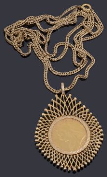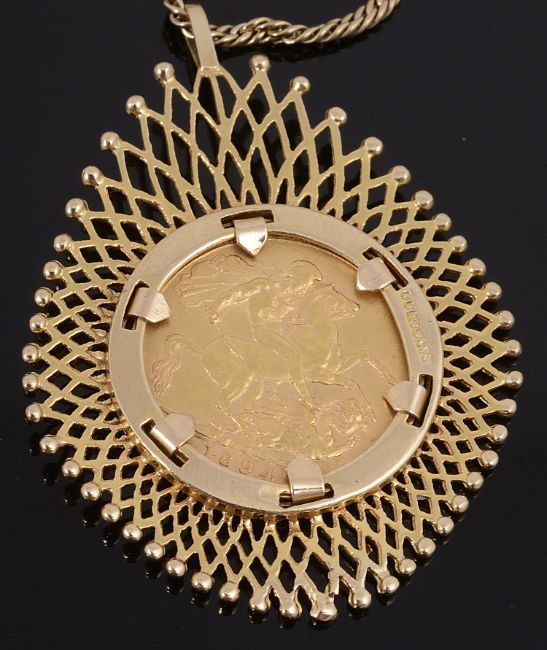 A Victorian sovereign dated 1894 channel set to a 9ct gold pendant suspended from a curb link chain marked 375