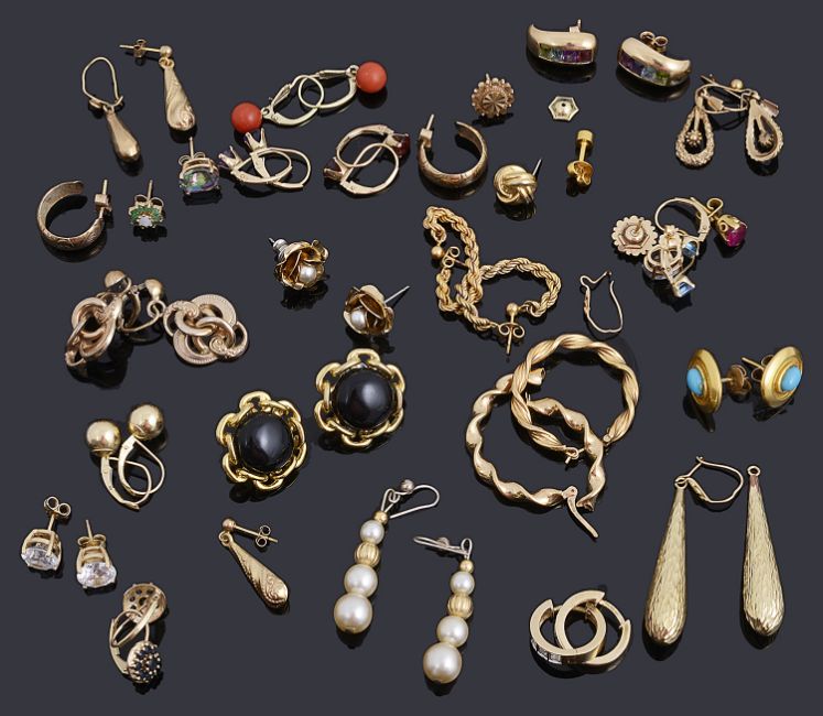 A large collection of gold earringsto include gold hollow earrings, a pair of 9ct gold gem set cuff earrings, a 9ct gold cuff earrings, a 9ct gold cuff earring, a pair of mystic topaz stud earrings marked 14k, a pair of gold hollow drop earrings, a pair of gold, a pair of amethyst stud earrings, a pair of cubic zirconia stud earrings marked 585 (qty)total weight approx including gemstones: 42.8gCondition: Some have slight wear consistent with age