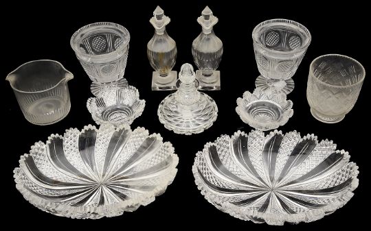 A collection of 19th century cut glasswarecomprising a pair of George III pouring cruet bottles and stoppers c.1800, cut with a band of flutes, on square bases, a table scent bottle with feather cut base and fitted with an acorn stopper, a pair of heavy lobed oval serving dishes cut with panels of strawberry cut diamonds, a pair of jars with absent a covers, a tea mixing bowl and a rinser and two epergne dishes, (11)height of cruet bottles 20.5 cm.Condition: Mostly good condition, one jar with a chip to rim