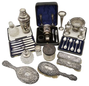A mixed lot of Edwardian and later silver and electroplated itemsvarious date and makerto include a rose bowl, a cased christening mug and napkin ring engraved with presentation inscription and initials, a silver mounted cut glass atomiser, a scent bottle and two matching pots, a near matching four piece embossed silver backed dressing table set, a pair of American silver cased glass urn shaped pepper pots, stamped Sterling weighted,a spill vase with weighted base, a napkin ring, a butter spreader, a cased set of six coffee spoons, a cased set of ivory handled tea knives with silver ferrules, an EPNS cocktail shaker, etc., (qty)first height 7.5 cm., weighable silver approx. 9.11 ozt.Condition: Christening set with absent spoon, rose bowl with dings to foot. Rose bowl wire plate with minor damage. Silver mounted cut glass scent bottle with damaged mount, jar lids with dings. Silver backed dressing table set with dings, hand mirror worn through on high points in a couple of places. One pepper pot with a ding to cover. Spill vase with a ding. Some light rubbing to cocktail shaker
