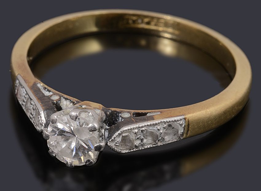 A single stone diamond ring circa 1920swith diamond set shoulders marked 18ct & Plattotal weight approx: 2.1g, diamond graded as SI2-P1, ring size K1/2Condition: in good conditionin good condition