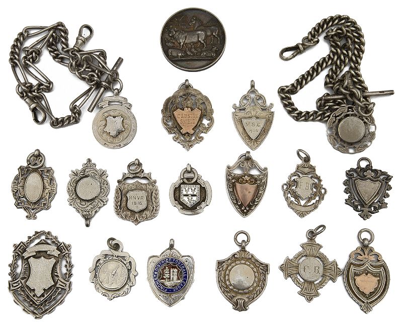 Two Victorian silver watch chains and a collection of silver fobsa curb link silver fob chain with t-bar and silver fob, a silver figaro chain with t-bar and fob, and fifteen assorted fobs including some engraved examples and a silver commemorative coin (qty)curb link chain approx. 38cm, figaro chain approx. 35.5cm in lengthCondition: All show wear consistent with age