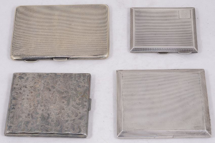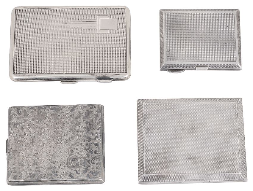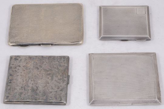 Two George V silver cigarette casesthe first Birmingham, 1934 by Mappin & Webb, of rectangular design with engine turned decoration ands sunken push catch, gilt interior with silver cigarette holder stamped PAT. 353934, bears presentation inscription, second of similar smaller design, Birmingham, 1928 by S Blanckensee & Son, together with a similar Art Deco plated cigarette case and another plated case chased with foliate design and presentation inscription, (4)first length 10.5 cm., total weight of silver cases 8.76 oztCondition: All cases in good condition commensurate with age