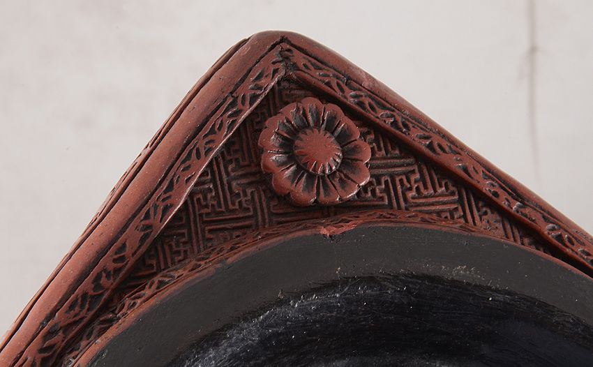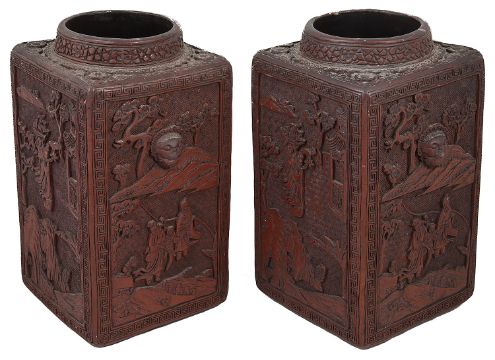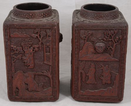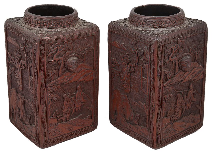 A pair of late 19th Chinese cinnabar lacquer square section vaseseach carved in relief with panels containing figures in a landscape against repeating geometric ground within a key fret border, each bearing a six character seal mark, one vase bearing paper label (2)height 27 cm.Condition: Overall fair condition. One vase has some slight chips to the rim, one chip to leaves on one panel.