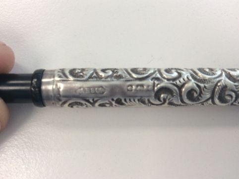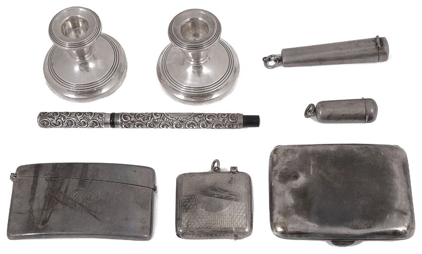 A mixed lot of Edwardian and later silver comprising and Edward VII engine turned square vesta, Chester, 1909 by Cohen & Charles, a plain curved hip card case engraved with initials , Birmingham, 1906 by Cohen & Charles, a plain cigarette case, and a foliate embossed silver cased fountain pen, two cheroot holder cases and a pair of small squat candle candlesticks with weighted bases, (8)