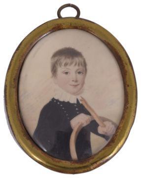 Portrait miniature, early 19th century English school c.1810'Half length portrait of a boy wearing a collared skeleton suit and holding a hoop and stick', watercolour on ivory, oval, unsigned, brass frame10 x 8 cm.Condition: Good condition, some tarnish to brass frame