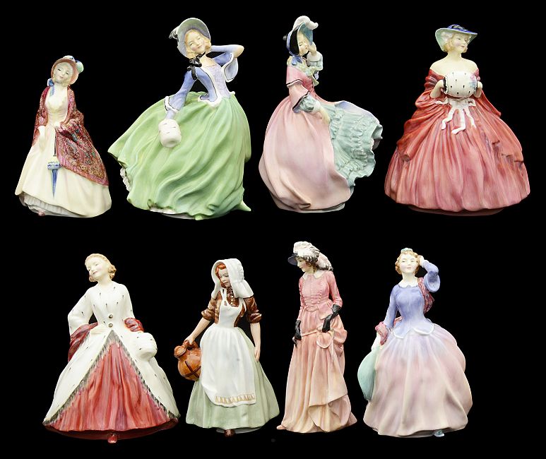 Eight Royal Doulton porcelain figures'Spring Morning', HN1922, 'Genevieve' HN1962, 'Maureen' HN1770, 'Autumn Breezes', 'Blithe Morning' H2021, 'The Ermine Coat' HN1981, 'Paisley Shawl' HN1988 and 'The Milkmaid' HN2057, (8)height 20 cm.Condition: Good condition