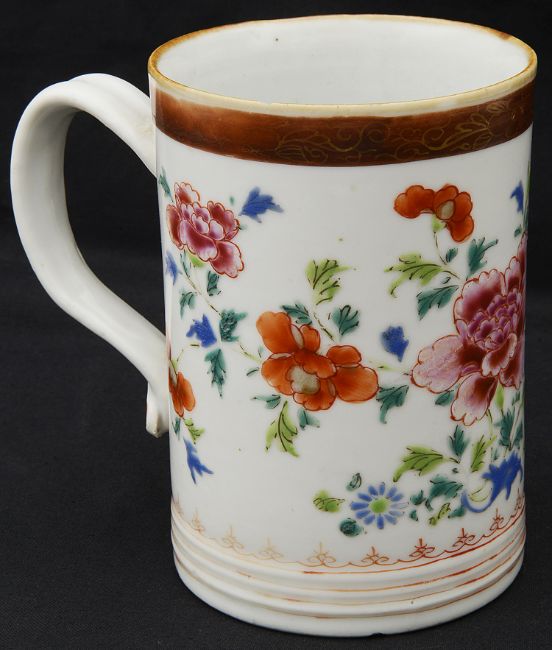 An 18th century Chinese export famille rose porcelain mugof cylinder for with loop handle terminating in ruyi head, decorated with flowersheight 12 cm.Condition: Good condition. V slight chip to rim, only noticeable on close inspection
