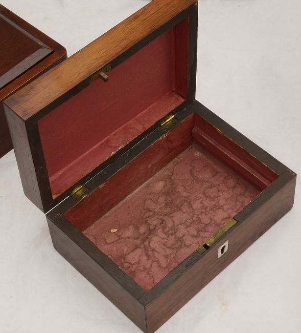 A Victorian papier mache watch stand and 19th century and later boxes comprising a mother of pearl and gilt decorated papier mache watch stand, a large Edwardian mahogany box, the hinged lid painted with an oval fan paterae, an early Victorian rosewood box inlaid with mother of pearl, a folding parquetry and bone inlaid cribbage board with pegs and a mahogany tea caddy, (6)first height 24.5 cm., length 32.7 cm. Condition: Fair condition. Watch stand with a losses and an old break with repair. Rosewood box without interior lift out tray. Cribbage board with scratches to varnish PLEASE NOTE THIS LOT CONTAINS 6 ITEMS