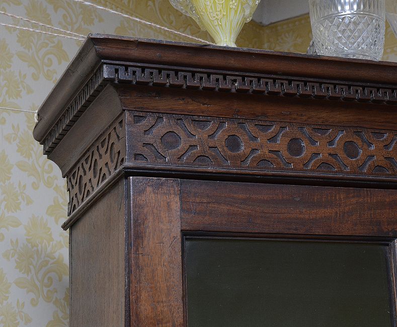 A George III mahogany secretaire bookcase of narrow proportions the upper section with projecting Greek key cornice and blind fret cut frieze, above an astragal glazed door, the secretaire drawer fitted with pigeonholes over three graduated long drawers, canted blind fret cut sides, raised on bracket feetheight 176cm., width 75 cm., depth 51 cm.Condition: The astragal section is associated. Moulding strip on one corner is slightly proud, original handles and escutcheonPlease note this lot needs to be collected and paid for by Friday 11th September 4:30pm
